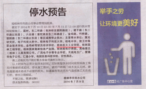 兹定于2014年7月10日22:00至7月11日12:00进行供水管网驳接施工。届时,东二环路(南洲桥至朝阳路段)、建干路(东二环路以东段)、六合路(普陀路至东二环路段)、金鸡路、竹桥路、朝阳路(东二环路以东段)等区域将停止供水;其中包含:桂林航天工业学院。