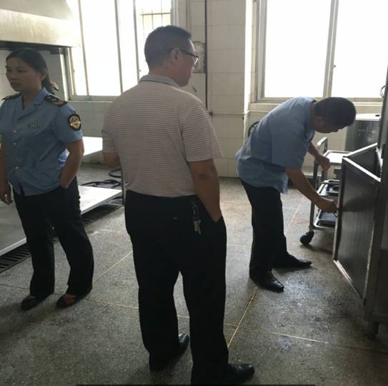 食药局检查组检查了我校食堂食品卫生工作,仔细查看了食堂后厨操作间的设施设备、操作流程以及食品制作等硬件设施。深入存储库房,认真检查和询问食用原辅材料质量安全情况,查看餐厨垃圾处理记录情况等。对食品安全管理的餐饮服务许可证、食品消毒记录、日常管理档案等情况条件进行了仔细查看。