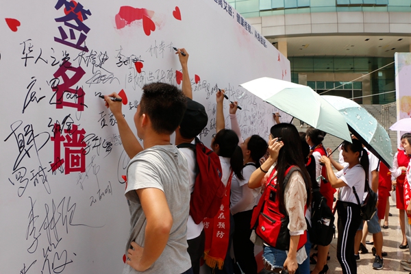 活动中,师生纷纷在“洁身自好、远离艾滋;健康桂航、从我做起”主题横幅上签名,表达了自己参与“红丝带”的勇气和决心,师生表示要行动起来,向“零艾滋”努力。
