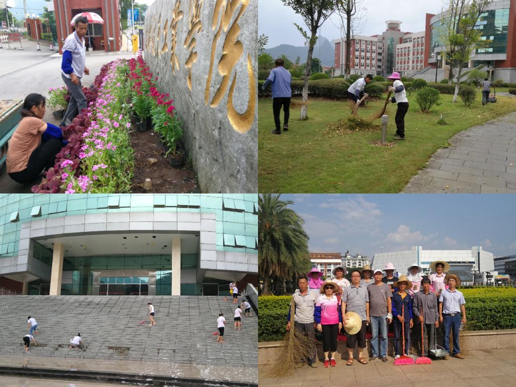 暑假期间,按照桂林市的统一安排和学校的要求,物业管理科组织人员参加桂林市周末环境卫生大清扫活动,每周五按时组织人员完成打扫桂林市中心广场的任务。