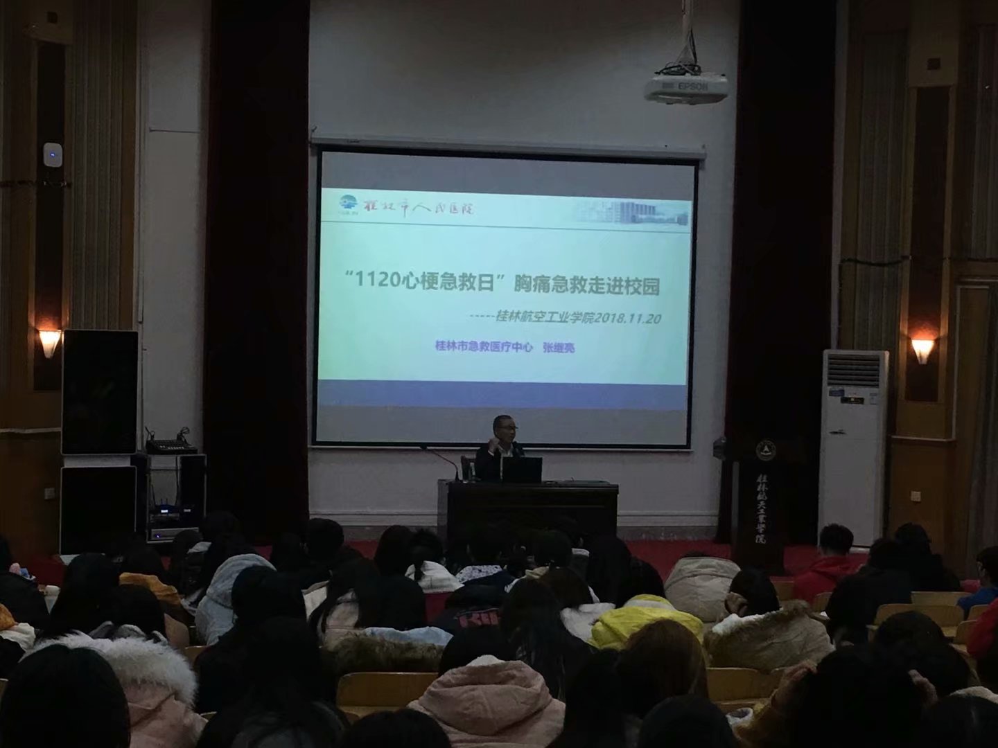 2014年我国首次设立“心梗救治日”,确定每年的11月20日为“中国1120心梗救治日”。为迎接第五个“中国1120心梗救治日”的到来,提高公众对心肌梗死及其防治的认识,11月20日下午,桂林市人民医院胸痛中心到我校举办了“1120心梗救治日”公益活动,中心主任张继亮进行主讲。活动当天共有200多名师生参加。