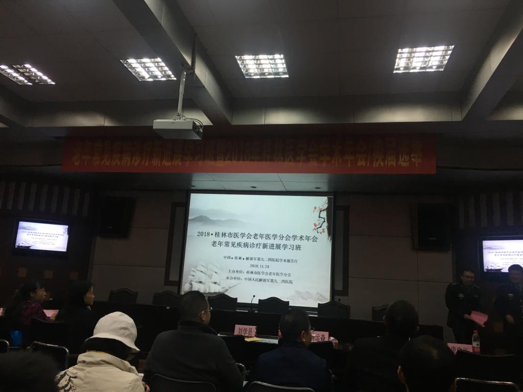 11月24日,由中国人民解放军第九二四医院承办的桂林市医学会老年医学会2018年学术年会暨老年常见疾病诊疗新进展学习班,在医院的学术报告厅顺利举行,我校卫生所医护人员参加此次学习班。