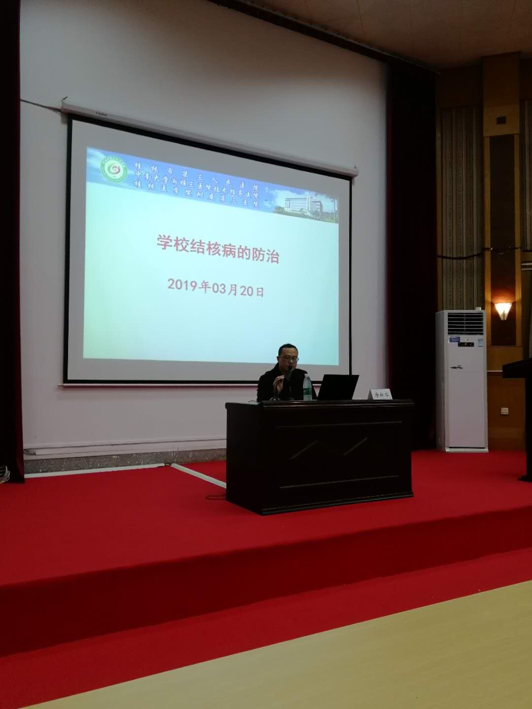 每年3月24日是世界防治结核病日,春节正是呼吸道传染病高发的季节,为了提高学校结核病防治知识的知晓率,3月20日下午15:00,桂林市第三人民医院肺病科及耐药结核病区主任唐新华在北校区2108教室作了题为《学校结核病的防治》的专题讲座,全校200余名学生聆听了讲座。