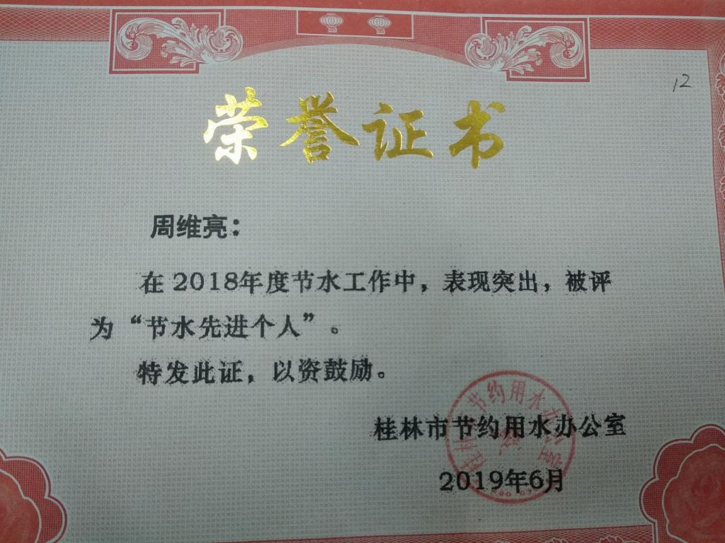 会议宣读了2018年度桂林市节水先进单位及先进个人表彰文件,我校被授予2018年度桂林市节水先进单位,周维亮同志获得节水先进个人荣誉称号。