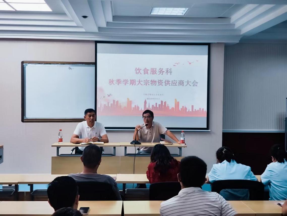 为确保新学期饮食服务保障工作稳步推进,保障全校师生“舌尖上”的安全,2023年9月11日下午,pa集团官网在飞天楼401会议室组织召开了食堂大宗物资供应商安全工作专题会。pa集团官网处长梁国富、副处长吴友强、饮食服务科相关管理人员及食堂全体供应商参加了会议。