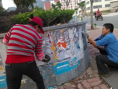 在清理校园小广告活动中,后勤物业管理科高度重视,动员5名优秀保洁员参加,使用铲刀、喷壶、全能清洁剂,共清理涂写广告面积百余平方米,清理工作取得良好的效果。同时,物业管理科还将加大对全院小广告的巡视清理力度,要求物业服务人员遇到不良行为要及时劝阻,最大限度减少“小广告”对学校环境造成的影响,别再让小广告脏了校园的“脸”。